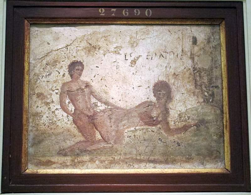 Fresk pochodzi z Pompei, znany jest pod nazwą LENTE IMPELLE, datowany jest na I połowę I w. n.e. i znowu wersja włoska podaje mi, że pochodzi ze słynnego lupanaru i nawet będąc tam widziałam go, i w wielu książkach dotyczących Pompei ten cykl fresków opisywany jest jako własnie obrazki, które możemy zobaczyć na ścianach domu publicznego.... a wersja angielska katalogu podaje taki oto adres: House of the King of Prussia, VII.9.33. 🤔🤔🤔 I co ja mam zrobić? Zawołać Malgorzata Sobolewska na pomoc? Chyba tylko to..... Nr katalogowy 27690.