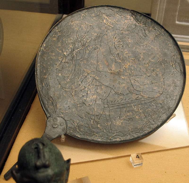 A dziś ETRUSKIE LUSTRO z brązu, ze sceną erotyczną, datowane na IV w. p.n.e. a należące do kolekcji Borgiów.