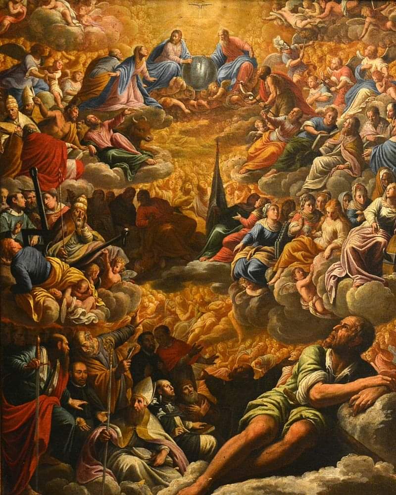 Obraz "RAJ" (Paradiso) znajdujący się na Capodimonte datowany jest na 1621 r. i nie jest to jedyny obraz raju przedstawiany przez tego malarza. Tak czy inaczej na pierwszy rzut oka raju mi nie przypomina.... Sądząc z zagęszczenia ludności, jak i po kolorach, byłabym raczej skłonna uznać go za przedstawienie piekła, wszak ten pomarańcz kojarzy mi się bardziej z piekielnym ogniem (raj jakoś zawsze wyobrażam sobie w błękitach). Ludzie ukazani na obrazie to święci i ludzie Kościoła, których owszem, w ciągu wieków wielu się zebrało, ale mimo wszystko wydaje mi się, że malarz próbując umieścić w swym dziele jak największą ilość świętych (ponoć rozpoznawalnych po różnego typu atrybutach, nie są to zatem tylko postaci tworzące tłum) dokonał pewnego przekłamania, sugerując mimowolnie, że raj jest miejscem, do którego stosunkowo łatwo się dostać. Poza tym mnie akurat ten tłum ludzi wcale nie zachęciłby do tego, żeby się tam pchać. Ciekawe jakie jest wasze zdanie na ten temat.