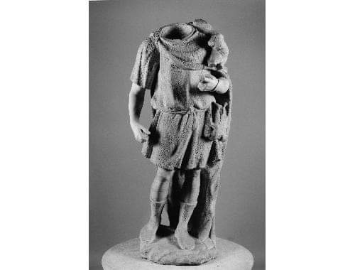 No dobra. To tyle mojego "mądrowania". Rzeźba wykonana została z białego marmuru, a przedstawiona postać ma przy sobie zająca i ptaki, co pozwala zinterpretować ją jako myśliwego. Nr katalogowy 6119.
