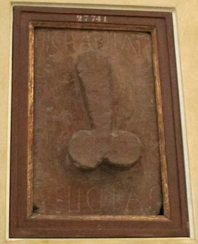 Dziś RELIEF Z FALLUSEM i inskrypcją: HIC HABITAT FELICITAS, co po łacinie oznacza: "tu mieszka szczęście". Nr katalogowy 27741.